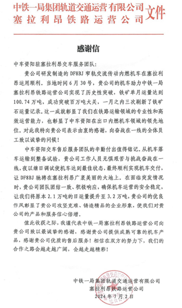 Le 2 juillet, la Société d'exploitation ferroviaire de Sierra Leone de China Railway First Group a envoyé une lettre de remerciement à CRRC Ziyang.